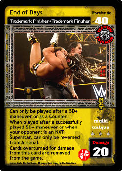 Can only be played after a 5D+ maneuver or as a Counter. When played after a successfully played 5D+ maneuver or when your opponent is an NXT Superstar, can only be reversed from Arsenal. Cards overturned for damage from this card are removed from the game.