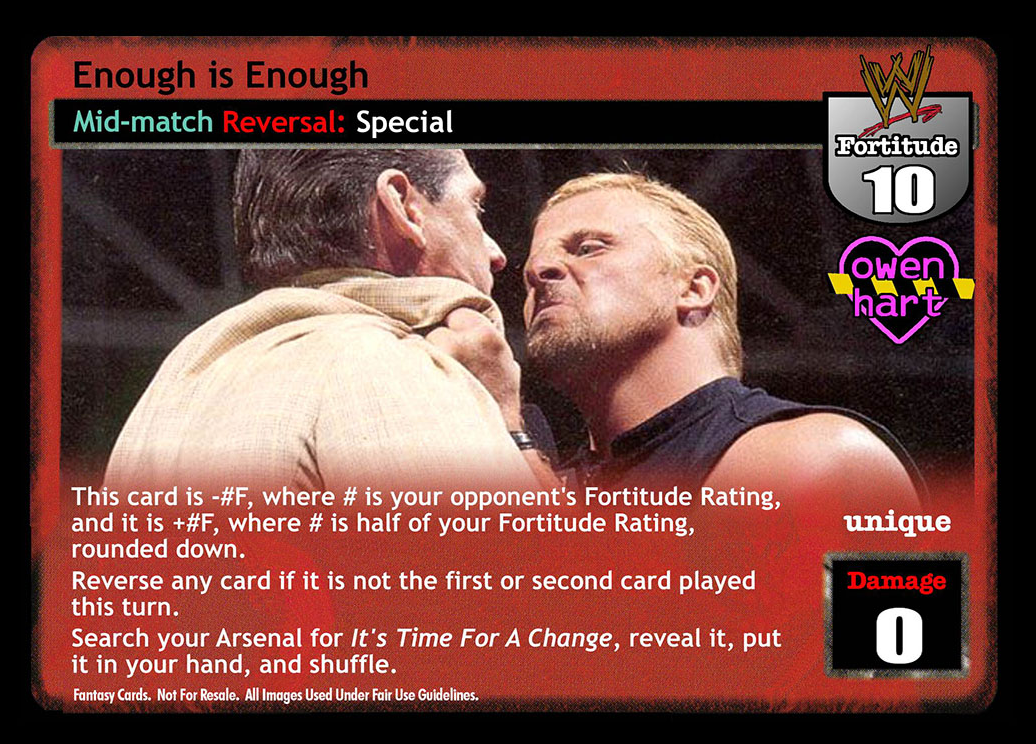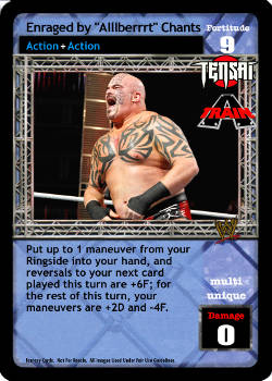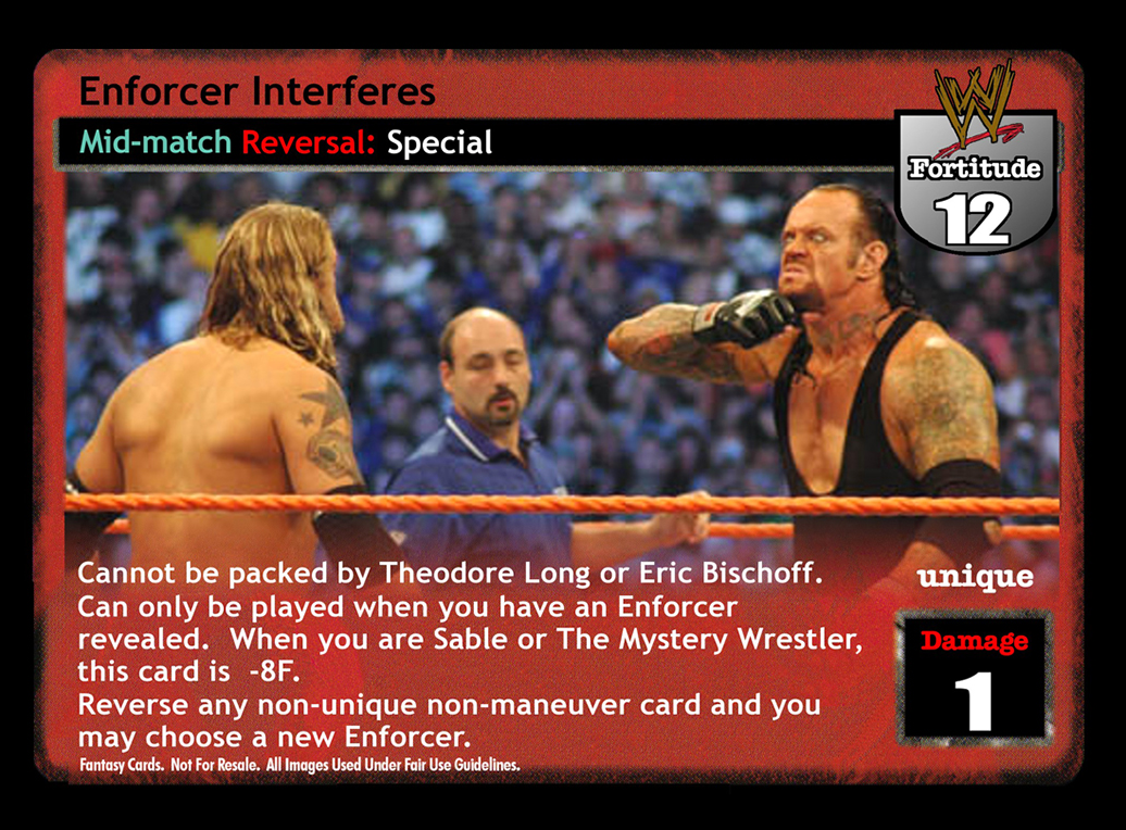 Cannot be packed by Theodore Long or Eric Bischoff. Can only be played if you have an Enforcer revealed. When you are Sable or The Mystery Wrestler, this card is -8F. Reverse any non-unique non-maneuver card, and you may choose a new Enforcer.