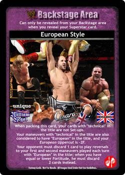 When packing this card, your cards with 'technical' in the title are not Set-ups. Your maneuvers with 'technical' in the title are also considered to have 'European' in the title, and your European Uppercut is -2F. Your opponent must discard 1 card to play reversals to your first and second maneuvers played each turn with 'European' in the title; when you have equal or lower Fortitude, he must discard 2 cards instead.