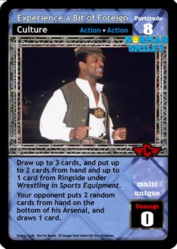 Draw up to 3 cards, and put up to 2 cards from hand and up to 1 card from Ringside under Wrestling in Sports Equipment. Your opponent puts 2 random cards from hand on the bottom of his Arsenal, and draws 1 card.