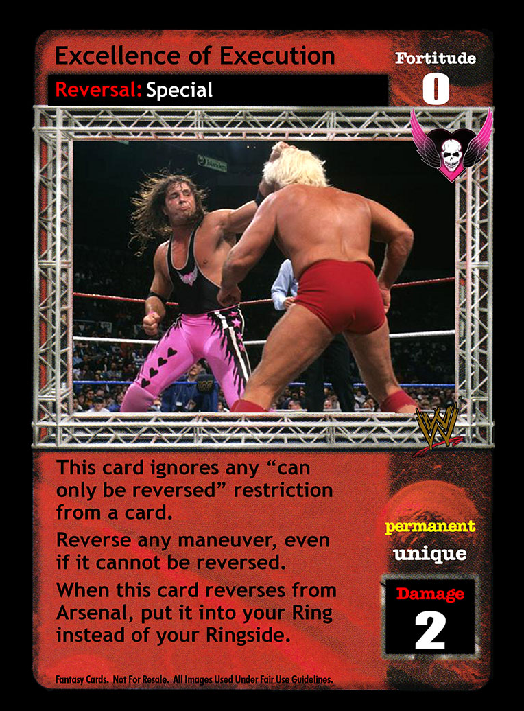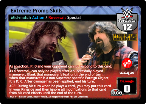 As an action, F: 0 and your opponent cannot respond to this card. As a reversal, can only be played after a successfully played maneuver. Blank that maneuver's text until the end of turn; when that maneuver is a non-Superstar-specific Foreign Object, it is D: 0. After damage has been applied, end his turn. ACE: During his turn when he plays a card, you may put this card in your Ringside and then ignore all modifications to that card from his card effects until the end of the turn.