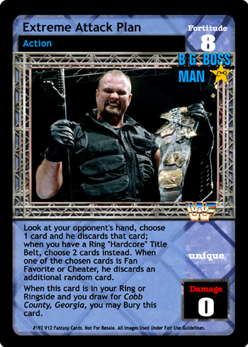 Look at your opponent's hand, choose 1 card and he discards that card; when you have a Ring 'Hardcore' Title Belt, choose 2 cards instead. When one of the chosen cards is Fan Favorite or Cheater, he discards an additional random card. When this card is in your Ring or Ringside and you draw for Cobb County, Georgia, you may Bury this card.