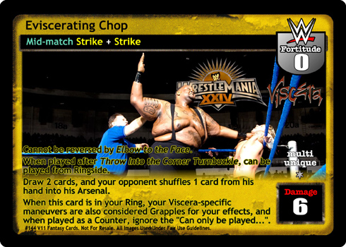 Cannot be reversed by Elbow to the Face. When played after Throw Into the Corner Turnbuckle, can be played from Ringside. Draw 2 cards, and your opponent shuffles 1 card from his hand into his Arsenal. When this card is in your Ring, your Viscera-specific maneuvers are also considered Grapples for your effects, and when played as a Counter, ignore the 'Can only be played...'.