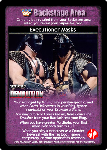 Your Managed by Mr. Fuji is Superstar-specific, and when Parts Unknown is in your Ring, ignore 'non-Multi' on your Drawing a Blank. You may put Here Comes the Ax, Here Comes the Smasher from your Backlash into your Ring. When you have greater Fortitude, your first maneuver each turn is +3D. When you play a maneuver as a Counter (reversal with the Tag logo), ignore 'completely' on your opponent's reversals.