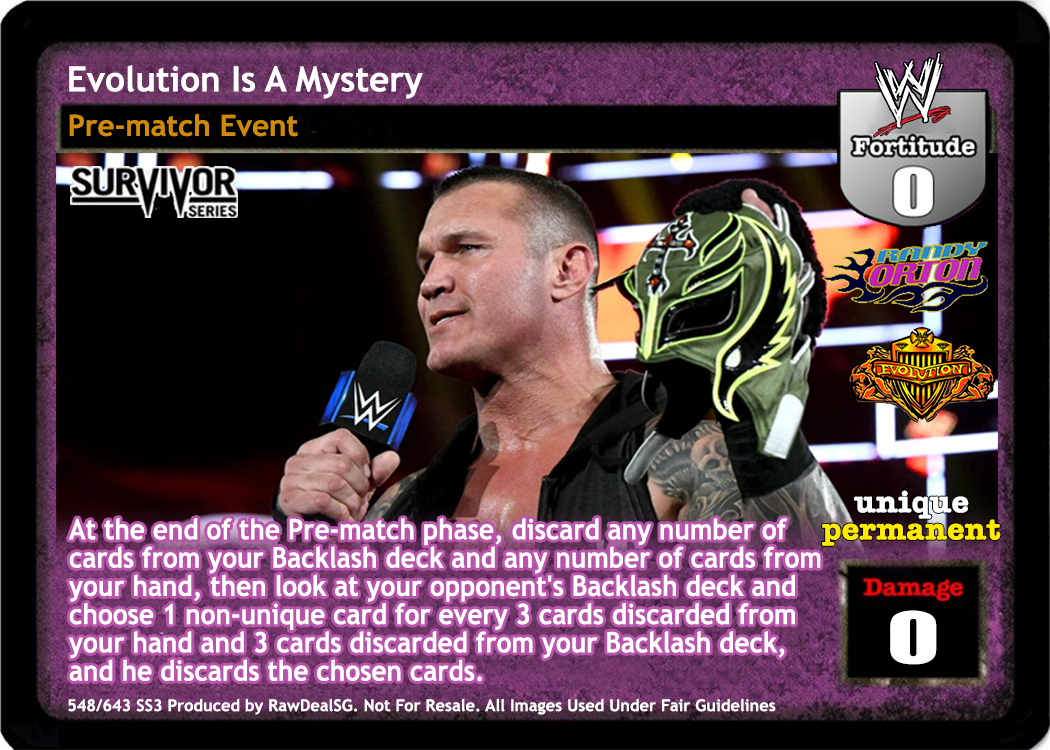 At the end of the Pre-match phase, discard any number of cards from your Backlash deck and any number of cards from your hand, then look at your opponent's Backlash deck and choose 1 non-unique card for every 3 cards discarded from your hand and 3 cards discarded from your Backlash deck, and he discards the chosen cards.