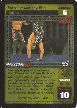 Can only be played after a successfully played maneuver or the card titled Throw Into the Corner Turnbuckle. When successfully played, look at your opponent's hand, choose up to 2 cards, and he discards the chosen cards. If the card titled Chair Shot or Ladder in the Ring is in any Ring area, instead choose up to 4 cards.