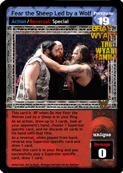 This card is -8F when Do Not Fear the Wolves Led by a Sheep is in your Ring. As an action, draw up to 3 cards, look at your opponent's hand, choose 1 Superstar-specific card, and he discards all cards in his hand with that title. As a reversal, when played from hand, reverse any Superstar-specific card and draw 1 card. When this card is in your Ring and you successfully play a Superstar-specific card, draw 1 card.