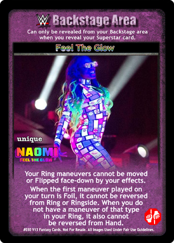 Can only be packed by a Throwback Superstar. Cannot be blanked. Your opponent's non-Unique reversals deal no damage, and when their text would cause you to lose the game via Pinfall Victory, the game continues. When you reveal your hand for The New Face of the Divas Division or his effects, put up to 1 card from your hand under this card. Cards under this card can be played as if from hand.