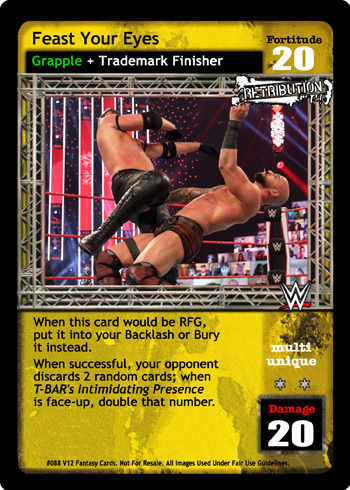 When this card would be RFG, put it into your Backlash or Bury it instead. When successful, your opponent discards 2 random cards; when T-BAR's Intimidating Presence is face-up, double that number.
