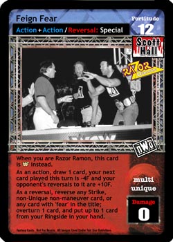When you are Razor Ramon, this card is WWF instead. As an action, draw 1 card, your next card played this turn is -4F and your opponent's reversals to it are +10F. As a reversal, reverse any Strike, non-Unique non-maneuver card, or any card with 'fear' in the title; overturn 1 card, and put up to 1 card from your Ringside in your hand.