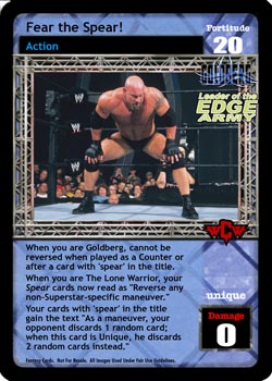 When you are Goldberg, cannot be reversed when played as a Counter or after a card with 'spear' in the title. When you are The Lone Warrior, your Spear cards now read as 'Reverse any non-Superstar-specific maneuver.' Your cards with 'spear' in the title gain the text 'As a maneuver, your opponent discards 1 random card; when this card is Unique, he discards 2 random cards instead.'