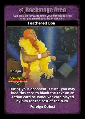 Can only be revealed from your Backstage area when you reveal your Superstar card. During your opponent's turn, you may hide this card to blank the text on an Action card or Maneuver card played by him for the rest of the turn.