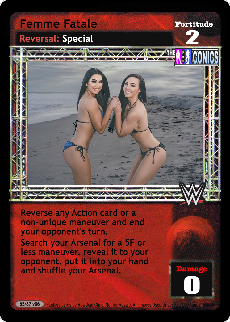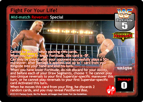Cannot be packed when packing nWo cards. When you have 5+ lower Fortitude, this card is -5F. Can only be played after your opponent successfully plays a 5D+ maneuver; after damage is applied, put up to 1 card from your Ringside into your hand and end his turn. When you have lower Fortitude, do not discard for your Ability, and before each of your Draw Segments, choose 1: he cannot play non-Unique reversals to your first Superstar-specific card this turn, or he cannot play reversals to your first Superstar-specific card Activated this turn. When he moves this card from your Ring, he discards 2 random cards, and you may reveal Feathered Boa.