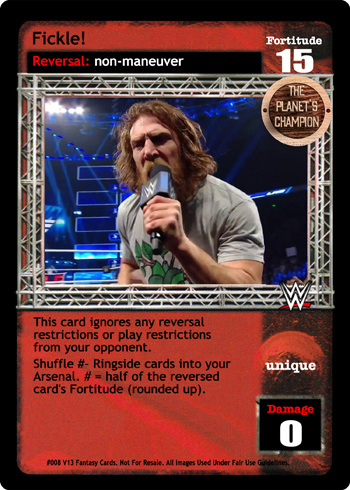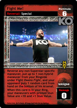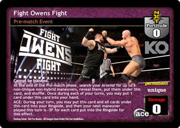 Reverse any non-Superstar-specific maneuver, put up to 1 non-hybrid maneuver from your Ringside under Fight Owens Fight, and your opponent puts 1 random card from hand on the bottom of his Arsenal. When this card is in your Ring, your maneuvers with printed Stun Value are +1D and +1 Stun Value.
