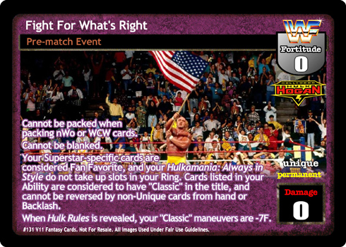 Cannot be packed when packing nWo or WCW cards. Cannot be blanked. Your Superstar-specific cards are considered Fan Favorite, and your Hulkamania: Always in Style do not take up slots in your Ring. Cards listed in your Ability are considered to have 'Classic' in the title, and cannot be reversed by non-Unique cards from hand or Backlash. When Hulk Rules is revealed, your 'Classic' maneuvers are -7F.