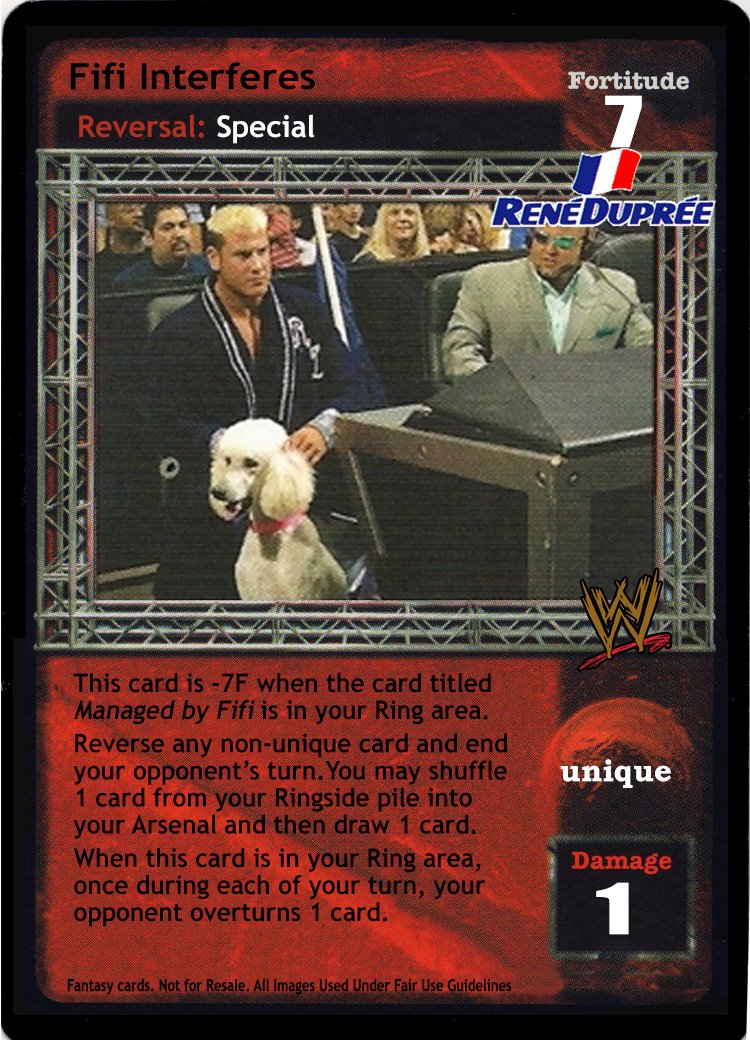 This card is -7F when the card titled Managed by Fifi is in your Ring area. Reverse any non-unique card and end your opponent's turn. You may shuffle 1 card from your Ringside pile into your Arsenal and then draw 1 card. When this card is in your Ring area, once during each of your turns, your opponent overturns 1 card.