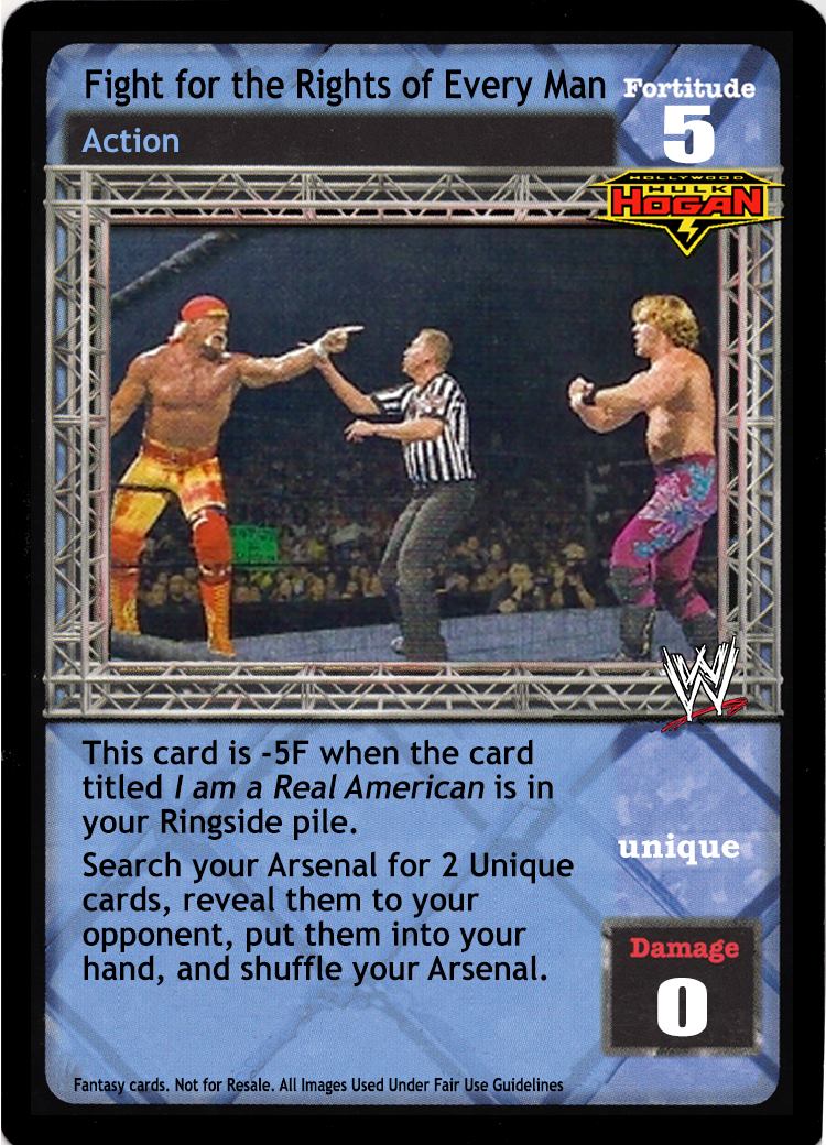 This card is -5F when the card titled I am a Real American is in your Ringside pile. Search your Arsenal for 2 Unique cards, reveal them to your opponent, put them into your hand, and shuffle your Arsenal.