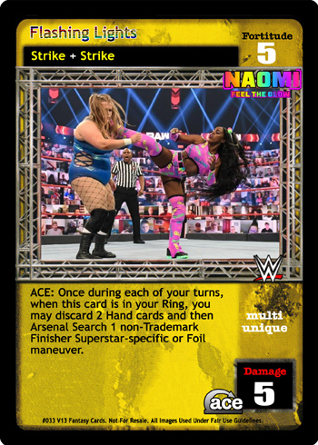ACE: Once during each of your turns, when this card is in your Ring, you may discard 2 Hand cards and then Arsenal Search 1 non-Trademark Finisher Superstar-specific or Foil maneuver.