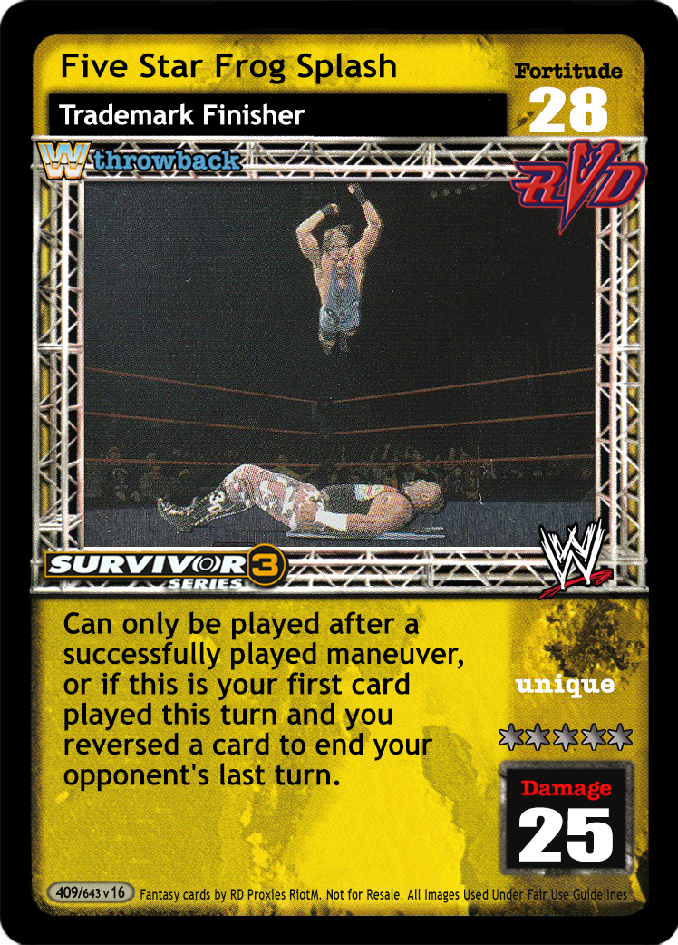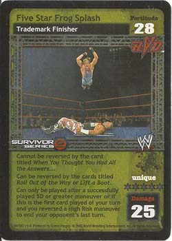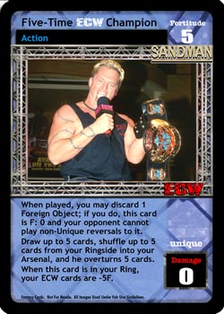 When played, you may discard 1 Foreign Object; if you do, this card is F: 0 and your opponent cannot play non-Unique reversals to it. Draw up to 5 cards, shuffle up to 5 cards from your Ringside into your Arsenal, and he overturns 5 cards. When this card is in your Ring, your ECW cards are -5F.