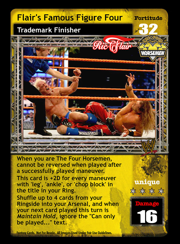When you are The Four Horsemen, cannot be reversed when played after a successfully played maneuver. This card is +2D for every maneuver with 'leg', 'ankle', or 'chop block' in the title in your Ring. Shuffle up to 4 cards from your Ringside into your Arsenal, and when your next card played this turn is Maintain Hold, ignore the 'Can only be played...' text.