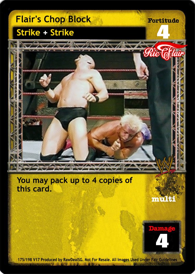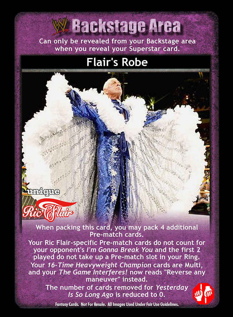 When packing this card, you may pack 4 additional Pre-match cards, your Ric Flair-specific Pre-match cards do not count for your opponent's I'm Gonna Break You and the first 2 played do not take up a Pre-match slot in your Ring. Your 16-Time Heavyweight Champion cards are Multi, The Game Interferes! now reads 'Reverse any maneuver' instead, and Revolution The Founder of the Four Horsemen adds to your Ability instead of replacing it. The number of cards removed for Yesterday Is So Long Ago is reduced to 0.