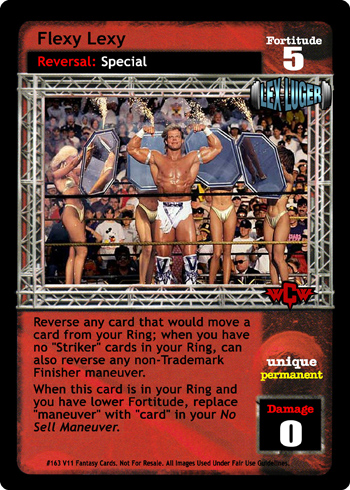 Reverse any card that would move a card from your Ring; when you have no 'Striker' cards in your Ring, can also reverse any non-Trademark Finisher maneuver. When this card is in your Ring and you have lower Fortitude, replace 'maneuver' with 'card' in your No Sell Maneuver.