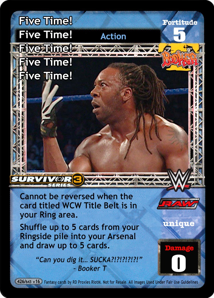 Cannot be reversed if the card titled WCW Title Belt is in your Ring area. Shuffle up to 5 cards from your Ringside pile into your Arsenal AND draw up to 5 cards.
