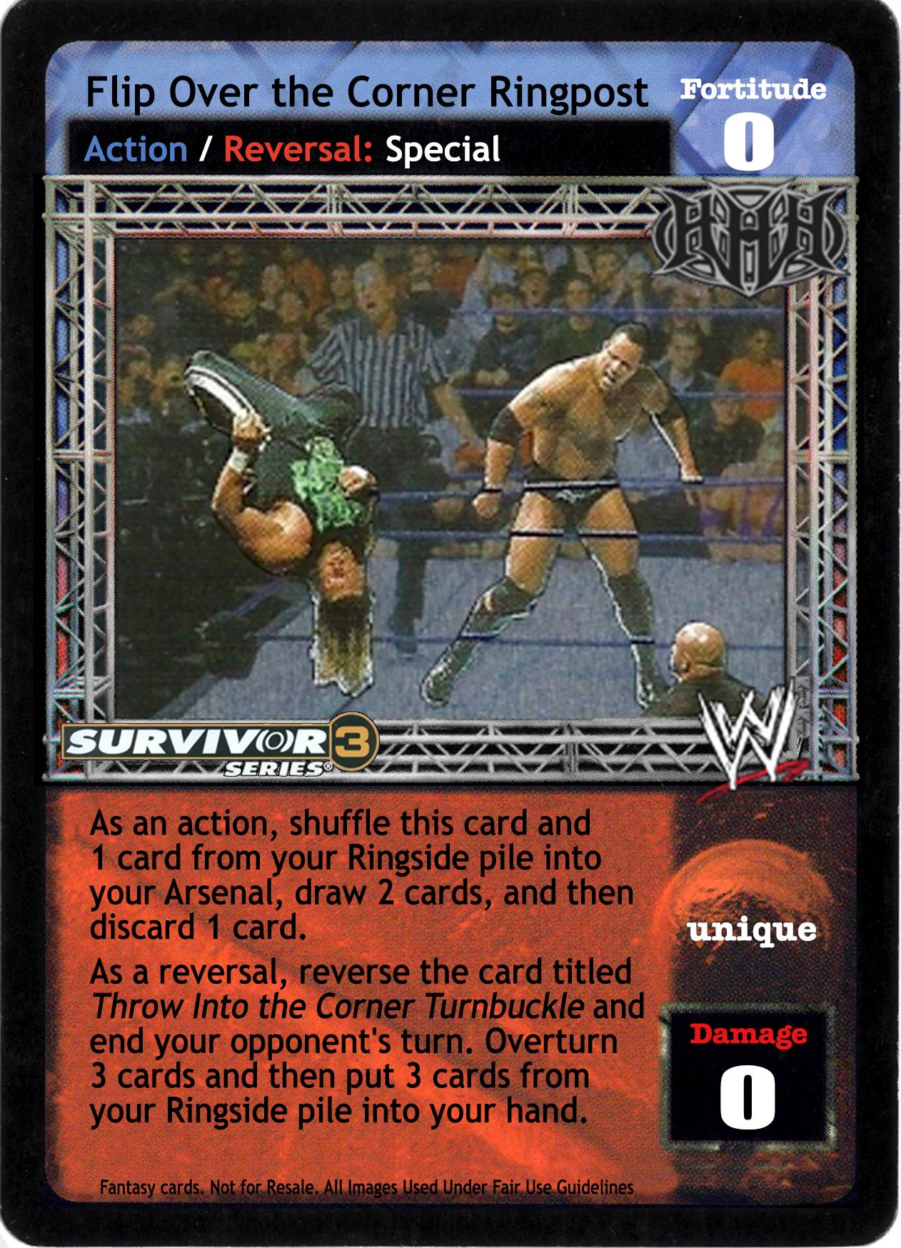As an action, shuffle this card and 1 card from your Ringside pile into your Arsenal, draw 2 cards, and then discard 1 card. As a reversal, reverse the card titled Throw Into the Corner Turnbuckle and end your opponent's turn. Overturn 3 cards and then put 3 cards from your Ringside pile into your hand.