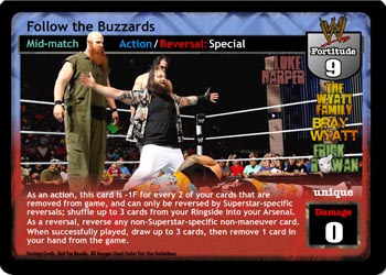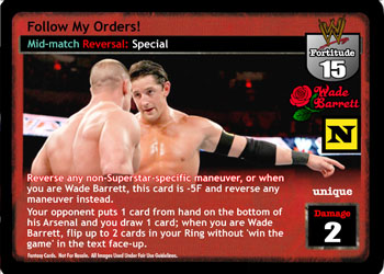 Reverse any non-Superstar-specific maneuver, or when you are Wade Barrett, this card is -5F and reverse any maneuver instead. Your opponent puts 1 card from hand on the bottom of his Arsenal and you draw 1 card; when you are Wade Barrett, flip up to 2 cards in your Ring without 'win the game' in the text face-up.