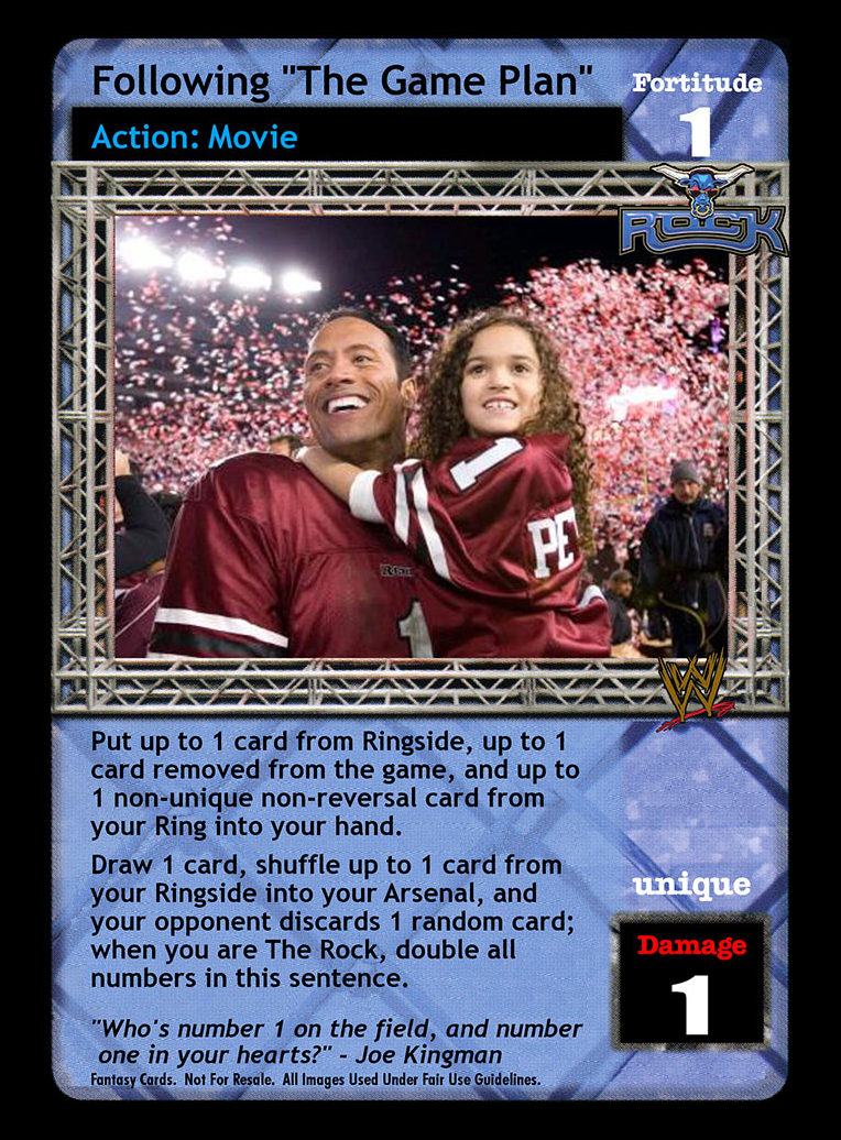 Put up to 1 card from Ringside, up to 1 card removed from the game, and up to 1 non-unique non-reversal card from your Ring into your hand. Draw 1 card, shuffle up to 1 card from your Ringside into your Arsenal, and your opponent discards 1 random card; when you are The Rock, double all numbers in this sentence.