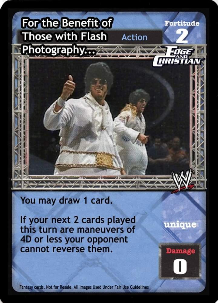 As an action, this card is -1F for every 2 of your cards that are removed from game, and can only be reversed by Superstar-specific reversals; shuffle up to 3 cards from your Ringside into your Arsenal. As a reversal, reverse any non-Superstar-specific non-maneuver card. When successfully played, draw up to 3 cards, then remove 1 card in your hand from the game.
