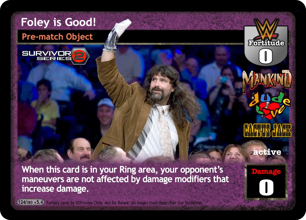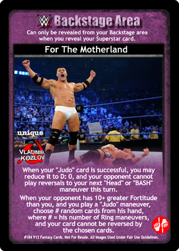 When your 'Judo' card is successful, you may reduce it to D:0, and your opponent cannot play reversals to your next 'Head' or 'BASH' maneuver this turn. When your opponent has 10+ greater Fortitude than you, and you play a 'Judo' maneuver, choose # random cards from his hand, where # = his number of Ring maneuvers, and your card cannot be reversed by the chosen cards.