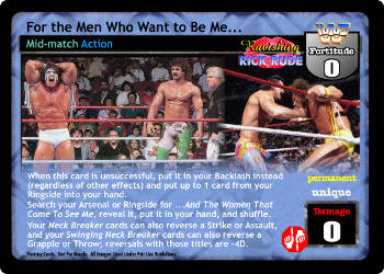 When this card is unsuccessful, put it in your Backlash instead (regardless of other effects) and put up to 1 card from your Ringside into your hand. Search your Arsenal or Ringside for ...And The Women That Come To See Me, reveal it, put it in your hand, and shuffle. Your Neck Breaker cards can also reverse a Strike or Assault, and your Swinging Neck Breaker cards can also reverse a Grapple or Throw; reversals with those titles are -4D.