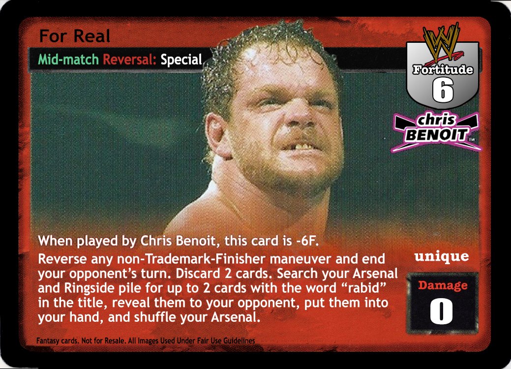 When played by Chris Benoit, this card is -6F. Reverse any non-Trademark-Finisher maneuver and end your opponent's turn. Discard 2 cards. Search your Arsenal and Ringside pile for up to 2 cards with the word "rabid" in the title, reveal them to your opponent, put them into your hand, and shuffle your Arsenal.