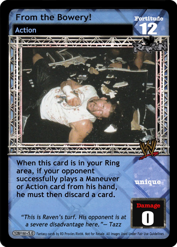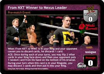 When From NXT to WWE is in your Ring and your opponent causes you to discard cards, he discards 1 card. ACE: Once during each of your turns, you may flip 2 other cards in your Ring face-down and then your opponent puts 1 random card from his hand on the bottom of his Arsenal. During your turn when this card is in your Ringside, you may discard 3 cards to put it into your Ring.