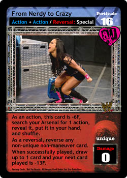 As an action, this card is -6F, search your Arsenal for 1 action, reveal it, put it in your hand, and shuffle. As a reversal, reverse any non-unique non-maneuver card. When successfully played, draw up to 1 card and your next card played is -13F.