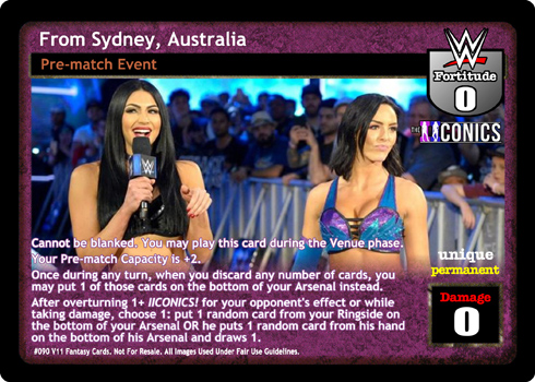 Cannot be blanked. You may play this card during the Venue phase. Your Pre-match Capacity is +2. Once during any turn, when you discard any number of cards, you may put 1 of those cards on the bottom of your Arsenal instead. After overturning 1+ IICONICS! for your opponent's effect or while taking damage, choose 1: put 1 random card from your Ringside on the bottom of your Arsenal OR he puts 1 random card from his hand on the bottom of his Arsenal and draws 1.