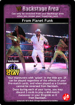 Your maneuvers with 'splash' in the title are -2F, can be played regardless of the effects of your Pre-match cards, and when played as a Counter cannot be reversed from Backlash. Once during each of your turns, you may discard 2 cards to play a Mid-match maneuver in your Ringside as if from Backlash.