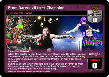Cannot be blanked. When this card is in your Ring, your Jeff Hardy-specific actions cannot be reversed by non-Unique reversals, and when your Fortitude Rating is 10-, your maneuvers are considered Unique for your opponent's reversals. During your turn when this card is in your Ringside or removed from the game, you may flip 2 cards in your Ring face-down or overturn 4 cards, and then put this card in your Ring.