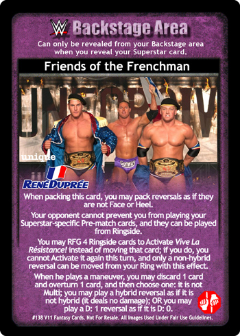 When packing this card, you may pack reversals as if they are not Face or Heel. Your opponent cannot prevent you from playing your Superstar-specific Pre-match cards, and they can be played from Ringside. You may RFG 4 Ringside cards to Activate Vive La Résistance! instead of moving that card; if you do, you cannot Activate it again this turn, and only a non-hybrid reversal can be moved from your Ring with this effect. When he plays a maneuver, you may discard 1 card and overturn 1 card, and then choose one: it is not Multi; you may play a hybrid reversal as if it is not hybrid (it deals no damage); OR you may play a D: 1 reversal as if it is D: 0.