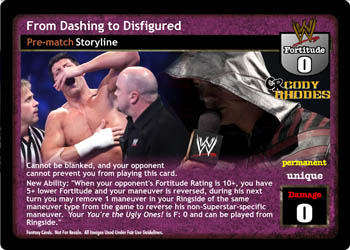 Cannot be blanked, and your opponent cannot prevent you from playing this card. New Ability: 'When your opponent's Fortitude Rating is 10+, you have 5+ lower Fortitude, and your maneuver is reversed, during his next turn you may remove 1 maneuver in your Ringside of the same maneuver type from the game to reverse his non-Superstar-specific maneuver. Your You're the Ugly Ones! is F: 0 and can be played from Ringside.'