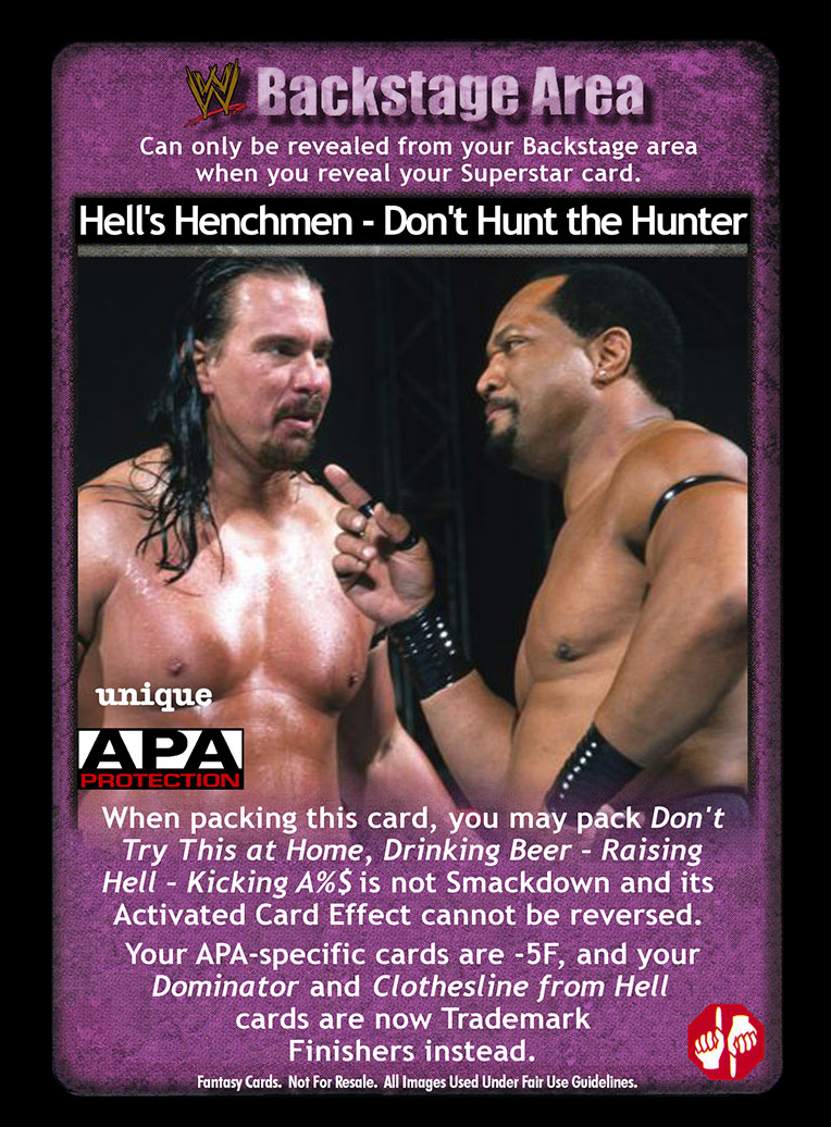 When this card is packed, you may pack Don't Try This at Home, and Drinking Beer - Raising Hell - Kicking Ass is not Smackdown, and its Activated Card Effect cannot be reversed. Your APA-specific cards are -5F, and your Dominator and Clothesline from Hell cards are now Trademark Finishers instead.