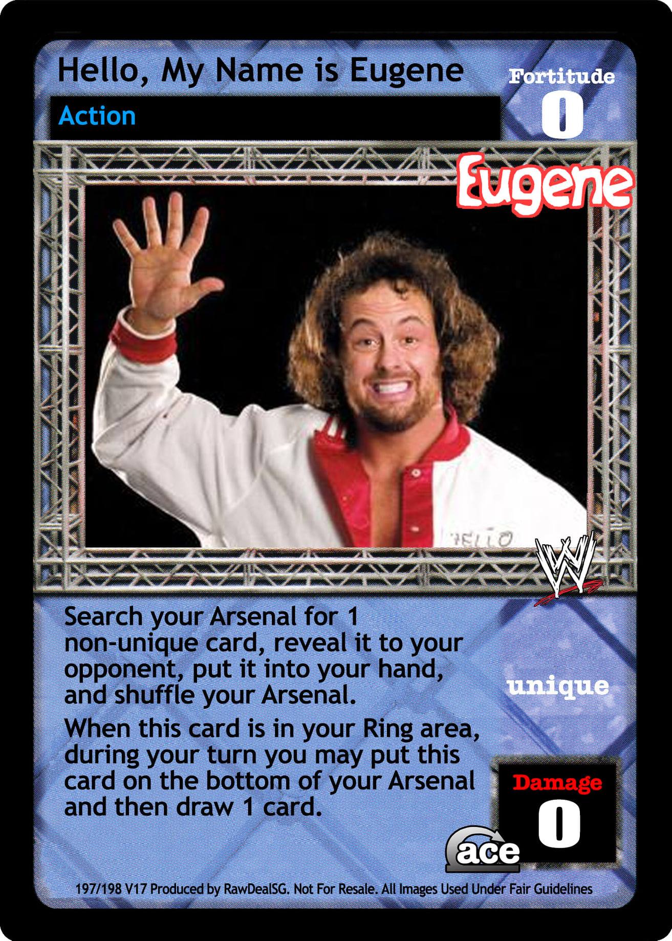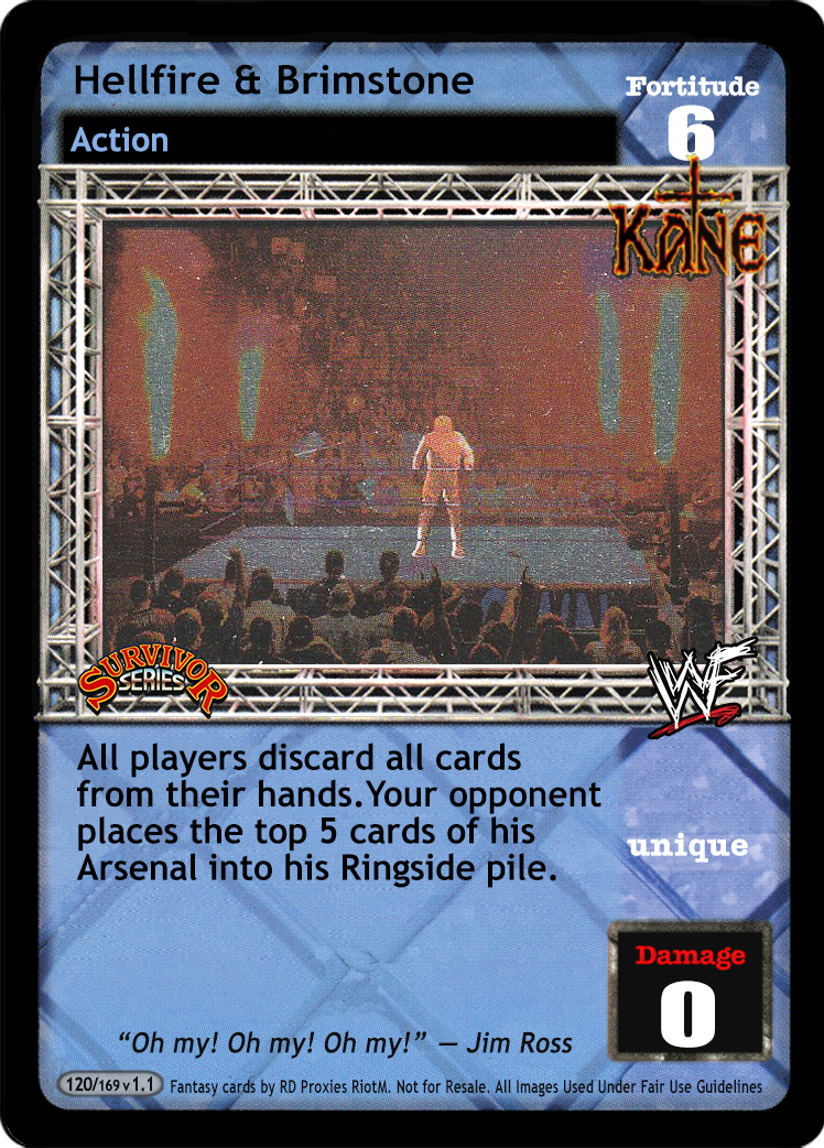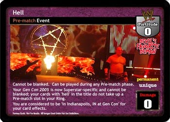 Cannot be blanked. Can be played during any Pre-match phase. Your Gen Con 2005 is now Superstar-specific and cannot be blanked; your cards with 'hell' in the title do not take up a Pre-match slot in your Ring. You are considered to be 'in Indianapolis, IN at Gen Con' for your card effects.