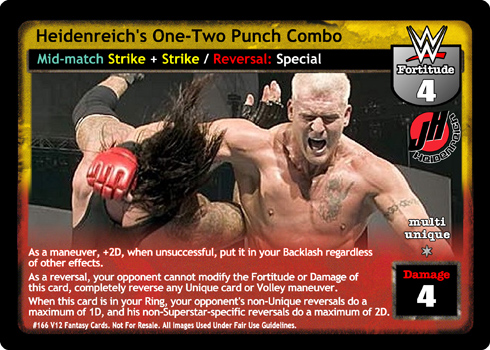 As a maneuver, +2D, when unsuccessful, put it in your Backlash regardless of other effects. As a reversal, your opponent cannot modify the Fortitude or Damage of this card, completely reverse any Unique card or Volley maneuver. When this card is in your Ring, your opponent's non-Unique reversals do a maximum of 1D and his non-Superstar-specific reversals do a maximum of 2D.