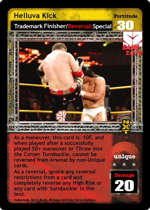 As a maneuver, this card is -10F, and when played after a successfully played 5D+ maneuver orThrow into the Corner Turnbuckle, cannot be reversed from Arsenal by non-Unique cards. As a reversal, ignore any reversal restrictions from a card and completely reverse any High Risk or any card with 'turnbuckle' in the text.