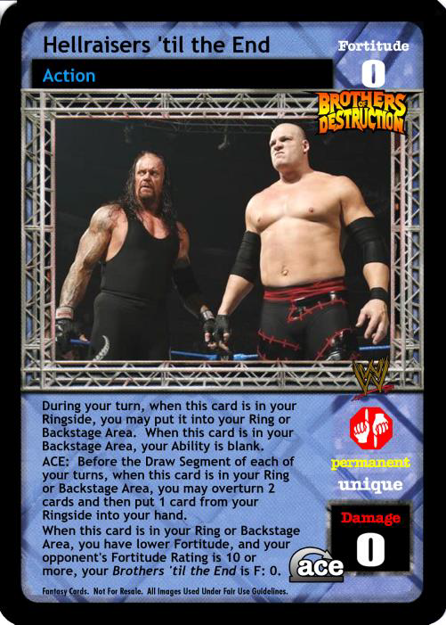 During your turn, when this card is in your Ringside, you may put it into your Ring or Backstage Area. When this card is in your Backstage Area, your Ability is blank. ACE: Before the Draw Segment of each of your turns, when this card is in your Ring or Backstage Area, you may overturn 2 cards and then put 1 card from your Ringside into your hand. When this card is in your Ring or Backstage Area, you have lower Fortitude, and your opponent's Fortitude Rating is 10+, your Brothers 'til the End is F: 0.