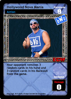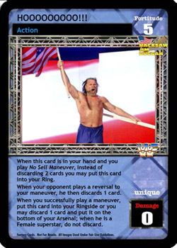 When this card is in your hand and you play No Sell Maneuver, instead of discarding 2 cards you may put this card into your Ring. When your opponent plays a reversal to your maneuver, he then discards 1 card. When you successfully play a maneuver, put this card into your Ringside or you may discard 1 card and put it on the bottom of your Arsenal; when he is a Female superstar, do not discard.