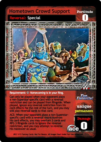 Requirement: WWE Homecoming is in your Ring. Can only be played when your opponent plays a non-Superstar-specific card with a reversal restriction and can be played from Ringside. When played, ignore any reversal restrictions from his card effects for the rest of the turn, and you may still play reversal cards to that card. ACE: When your opponent plays a non-Superstar-specific card with a reversal restriction from his card effects, you may overturn 3 cards and RFG 3 Ringside cards to ignore the reversal restriction, and you may attempt to reverse his maneuver as usual.