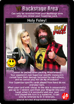 Cannot be packed when packing Wrestlemania. Your opponent's non-Superstar-specific maneuvers cannot have their damage increased by card effects, and he cannot play Not On My Broadcast! Your Superstar-specific cards played from hand do not end your turn. When your card with 'cheap' in the title is unsuccessful, put up to 1 random card from your Ringside into your hand; when it is successful and your next card played this turn is a maneuver, it can only be reversed by D: 0 reversals.