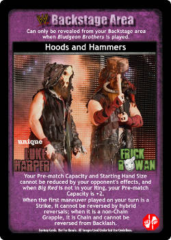 Can only be revealed from your Backstage Area when Bludgeon Brothers is played. Your Pre-match Capacity and Starting Hand Size cannot be reduced by your opponent's effects, and when Big Red is not in your Ring, your Pre-match Capacity is +2. When the first maneuver played on your turn is a Strike, it cannot be reversed by hybrid reversals; when it is a non-Chain Grapple, it is Chain and cannot be reversed from Backlash.